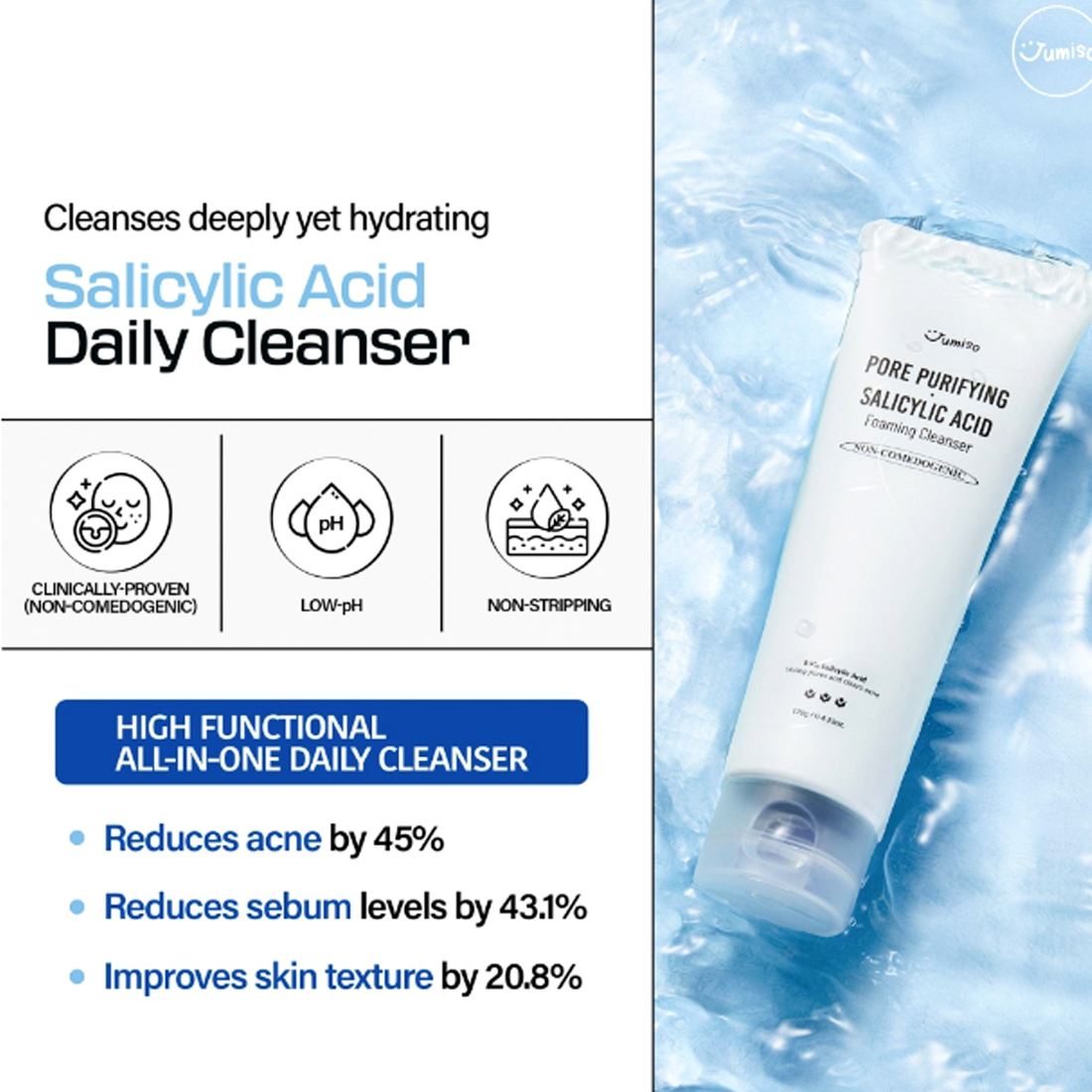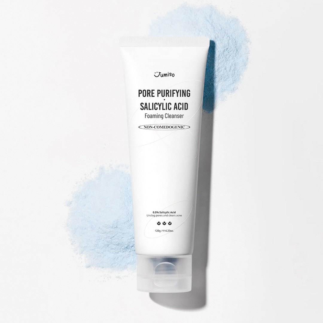 Korean foaming cleanser with 0.5% Salicylic Acid deeply cleanses and purifies pores for visibly smoother, clearer complexion while maintaining gentle daily use formula for all skin types